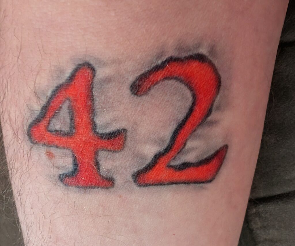 Die tatoeage is voor mij meer dan een verwijzing naar een boek; het is een werkethiek. Of ik nu een probleem oplos of een gesprek voer over de koers van het leven: ik zoek naar de 42.